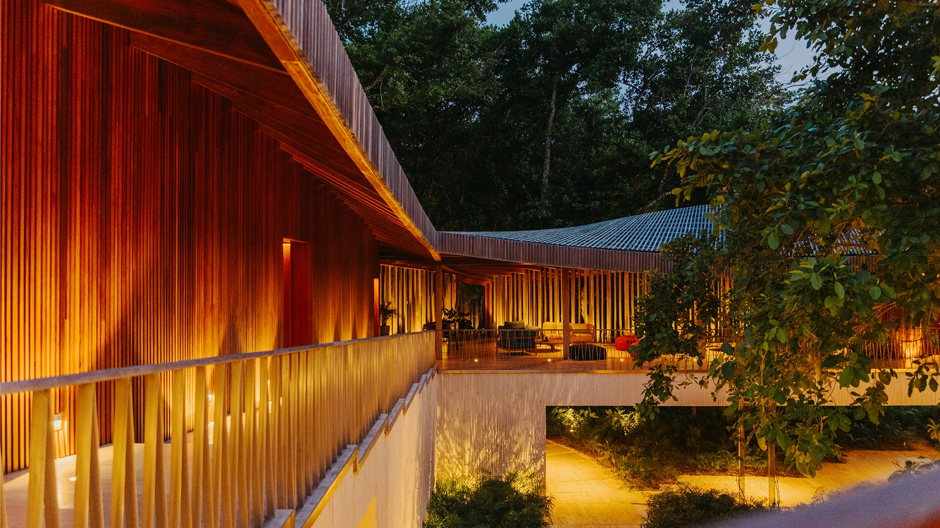 The design of the house and its additional structures integrates with the natural surroundings and creates a welcoming environment for wellness and creative retreats. The color palette and materials used focus on the contemporary and tropical, with a relaxing feel that invites guests to connect with the surrounding nature.